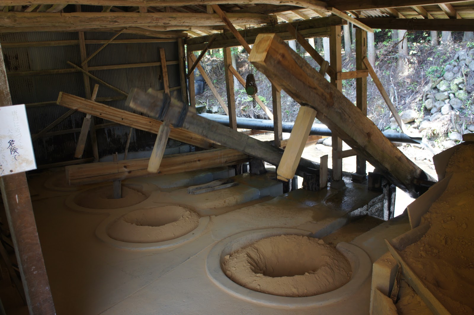 川の水を利用した、何て言うかドッスン・・ジャジャ~・・ドッスンと粘土の元土を杵でつく鹿威し構造のデカいものが有りました。
